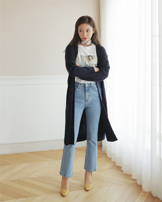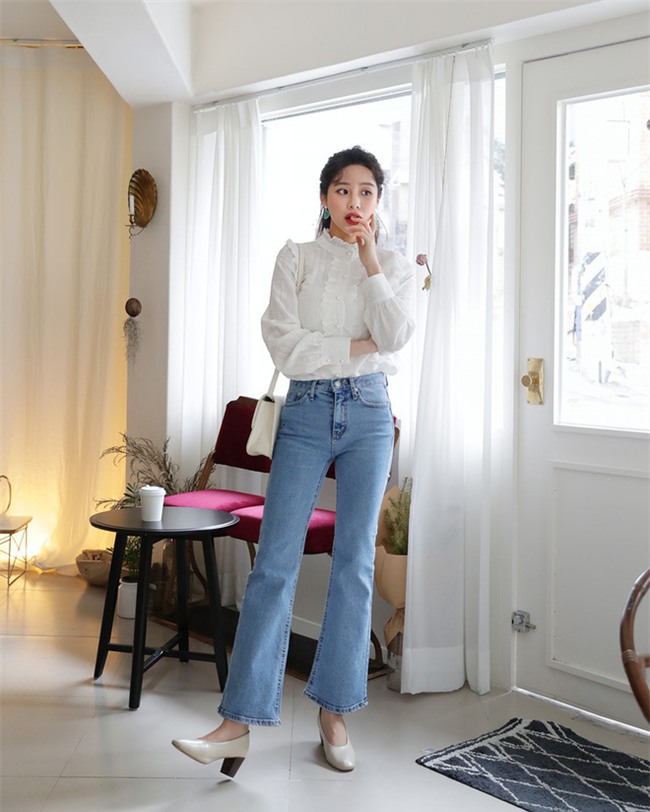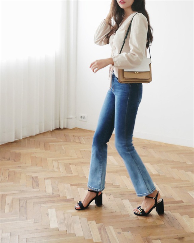 Với những chiếc quần jeans loe cạp cao sẽ giúp các nàng kéo dài đôi chân, tuy nhiên hãy nhớ jeans loe không phù hợp với tín đồ không thích sơ vin đâu nhé. Với kiểu quần này, bạn có thể sơ vin cả áo hay vạt trước vạt sau nhưng chung quy việc sơ vin sẽ giúp cho tổng thể nhìn thanh thoát hơn.