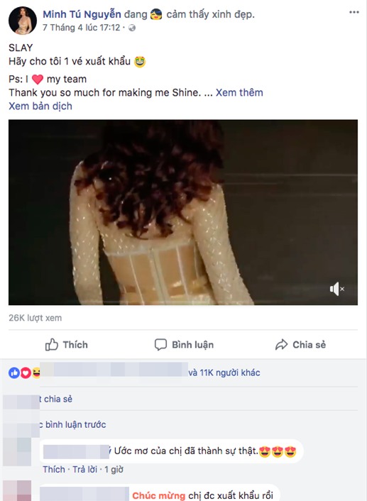 Ngay lập tức, hàng ngàn lượt chia sẻ, bình luận chúc mừng Minh Tú. Fan hâm mộ tin rằng với lợi thế về ngoại hình, kỹ năng catwalk, Minh Tú rất có thể sẽ làm nên chuyện tại đấu trường nhan sắc này. Trước đó, người đẹp được khoanh vùng lựa chọn nhiều nhất chính là Hoa hậu Hoàn vũ Việt Nam 2015 Phạm Hương.