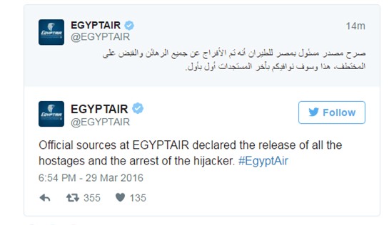 Hãng hàng không EgyptAir chính thức tuyên bố vụ khống chế máy bay đã kết thúc, tất cả các con tin được phóng thích và nghi phạm bị bắt giữ.