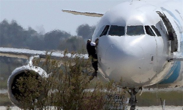 Kênh truyền hình Alarabiya dẫn thông báo từ Bộ hàng không dân dụng Ai Cập cho biết: "Chiếc Airbus A-320, chở theo 81 hành khách, trên lộ trình giữa Alexanderia và Cairo đã bị không tặc khống chế. Phi công cho biết một hành khách nói với ông ta rằng có áo khoác gài chất nổ, và đã buộc máy bay hạ cánh xuống đảo Síp".
