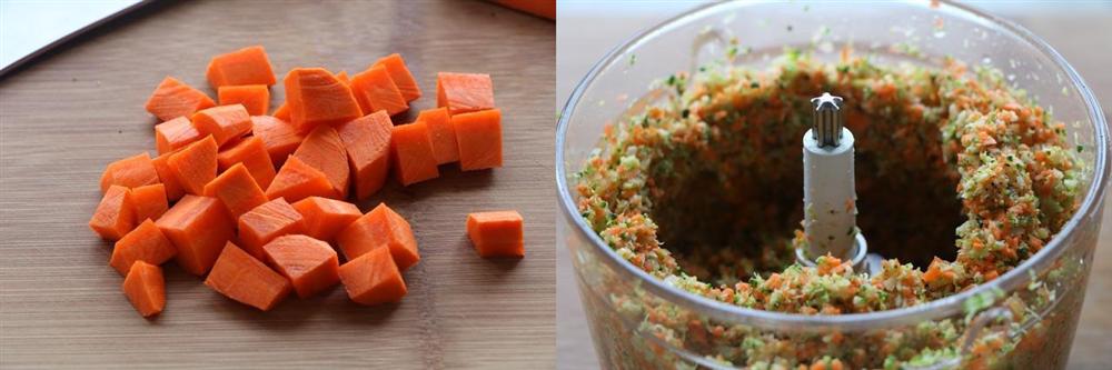 Cà rốt bào vỏ rửa sạch rồi thái khối. Cho cà rốt và súp lơ xanh vào máy xay, xay nhỏ.