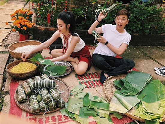 | Cặp bạn thân Đông Nhi – Ngô Kiến Huy tất bật gói bánh chưng chuẩn bị đón Tết.Trong khi bạn gái Ông Cao Thắng đang chăm chú vào công việc thì Ngô Kiến Huy chỉ ngồi tạo dáng nhí nhố để chụp ảnh. |