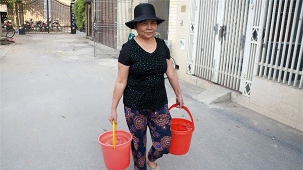 Giữa cái nóng xấp xỉ 40 độ C ở Hà Nội, b à Phạm Thị Mơ (70 tuổi, nhà số 9 dãy nhà TT1, khu đô thị Mỹ Đình – Sông Đà) mệt mỏi kể về việc gia đình bà phải xoay sở do mất nước sinh hoạt.