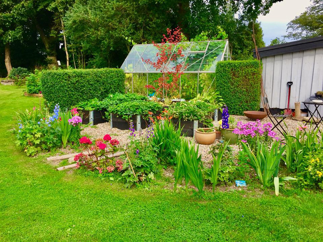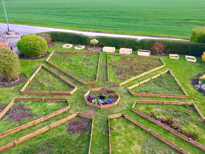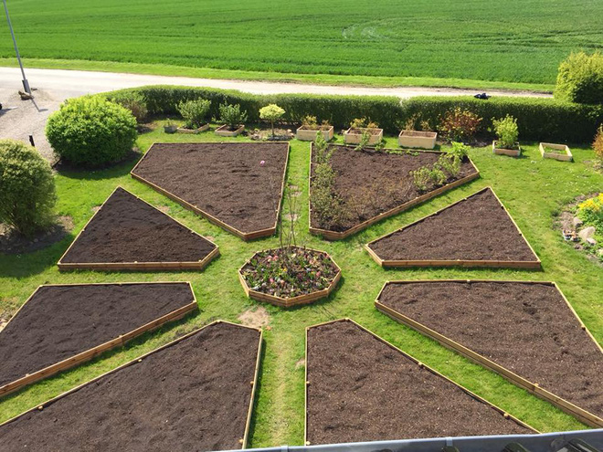 Bãi cỏ xanh rộng thênh thang đã biến thành khu vườn với những luống rau đẹp như trong mơ nhờ việc thiết kế từ khung gỗ. Họ đã cùng nhau thiết kế khu vườn đẹp như công viên. Janus cho biết, anh muốn đóng khung gỗ để phân chia từng luống để việc trồng các loại rau củ quả được dễ dàng hơn.