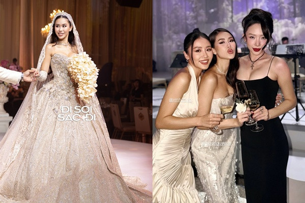 Về phần Tiên Nguyễn, cô nổi bật với chiếc đầm cưới Jimmy Choo. Bộ váy cúp ngực, siết eo theo phom corset giúp cô dâu khoe trọn vòng 1 gợi cảm và vòng 2 thon thả. Đặc biệt, chất liệu ren cao cấp dệt từ chỉ bạc, đính pha lê cùng hàng nghìn viên đá quý và Swarovski màu trong suốt, vàng đồng khiến cô dâu sang chảnh bội phần.
