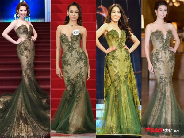 4. Chiếc đầm đuôi cá màu xanh rêu. Thúy Ngân mặc chiếc đầm này tại lễ trao giải Ngôi sao xanh tối ngày 11/1. Trước đó, trong thử thách catwalk tại cuộc thi Hoa hậu Hoàn vũ, Mai Ngô lựa chọn thiết kế này để trình diễn. Nam Em cũng đã từng lựa chọn chiếc đầm này để trình diễn trong đêm chung kết Hoa hậu Trái đất 2016. Chân dài Khánh My cũng đã từng mặc thiết kế được ưa chuộng này tại một sự kiện.