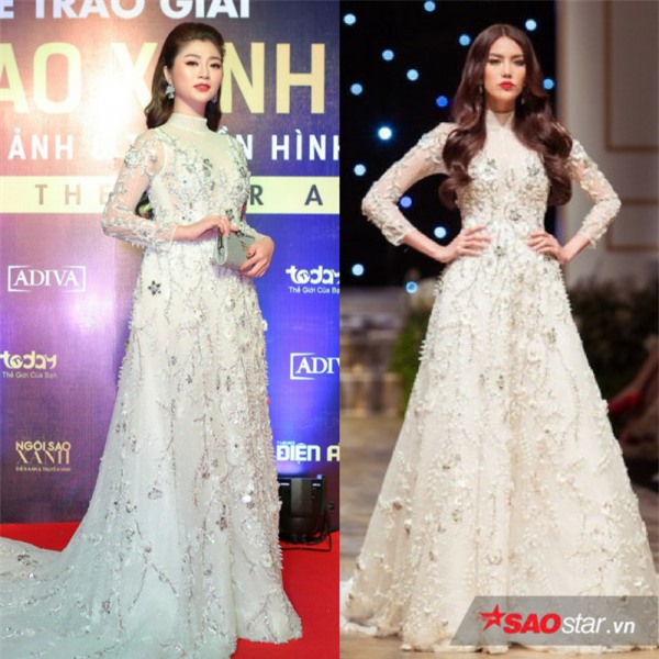 2. Chiếc đầm màu vàng phong cách hoàng gia. Xuất hiện trong lễ trao giải Ngôi Sao Xanh vào ngày 11/1, Nam Em đã mặc lại thiết kế mà Minh Hằng từng diện tại khuôn khổ tuần lễ thời trang Arab Fashion Week vào cuối năm 2017. Nếu Nam Em tiết chế phụ kiện nhất có thể thì Minh Hằng “mạnh tay” đầu tư bộ trang sức kim cương trị giá gần 20 tỷ đồng tăng phần sang trọng cho bộ cánh.