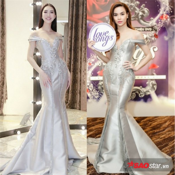 9. Chiếc đầm đuôi cá màu bạc. Cũng tại buổi thử đồ này, Tường Linh lại tiếp tục chọn lại thiết kế lộng lẫy từng được Hà Hồ chọn mặc tại một sự kiện trước đó khá lâu. Nếu Hà Hồ chọn kiểu tóc nâu vàng uốn xoăn thì Tường Linh nhẹ nhàng hơn với kiểu tóc đen xõa thẳng.