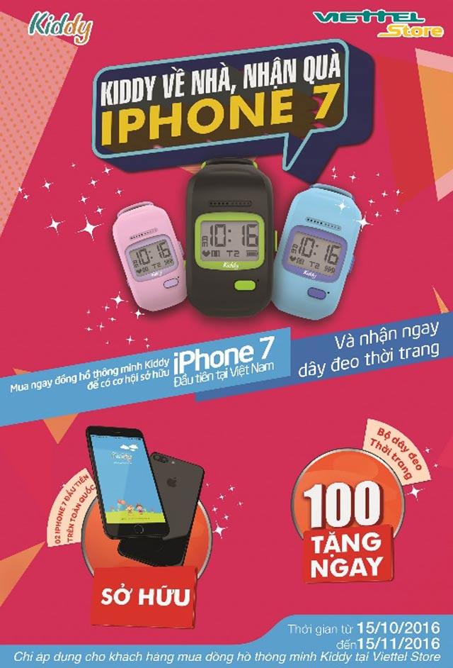 Theo đó, từ ngày 15/10 - 15/11/2016, khi mua đồng hồ thông minh Kiddy tại các cửa hàng Viettel Store trên toàn quốc hoặc mua qua website https://viettelstore.vn/, tất cả các khách hàngsẽ được tặng 1 bộ dây đeo đồng hồ các màu trị giá 50.000 đồng, đồng thời có cơ hội trúng thưởng iPhone 7 32 GB lần đầu tiên xuất hiện ở Việt Nam trị giá lên tới 20.000.000 đồng thông qua chương trình quay số may mắn.