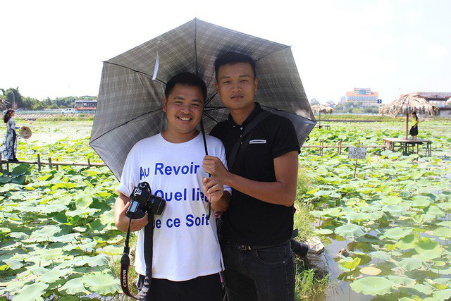 'Phó nháy' Nguyễn Minh Tiến (phải) mỗi ngày kiếm từ 1,5 - 2 triệu đồng nhờ nghề chụp ảnh cho khách tại đầm sen Hồ Tây.