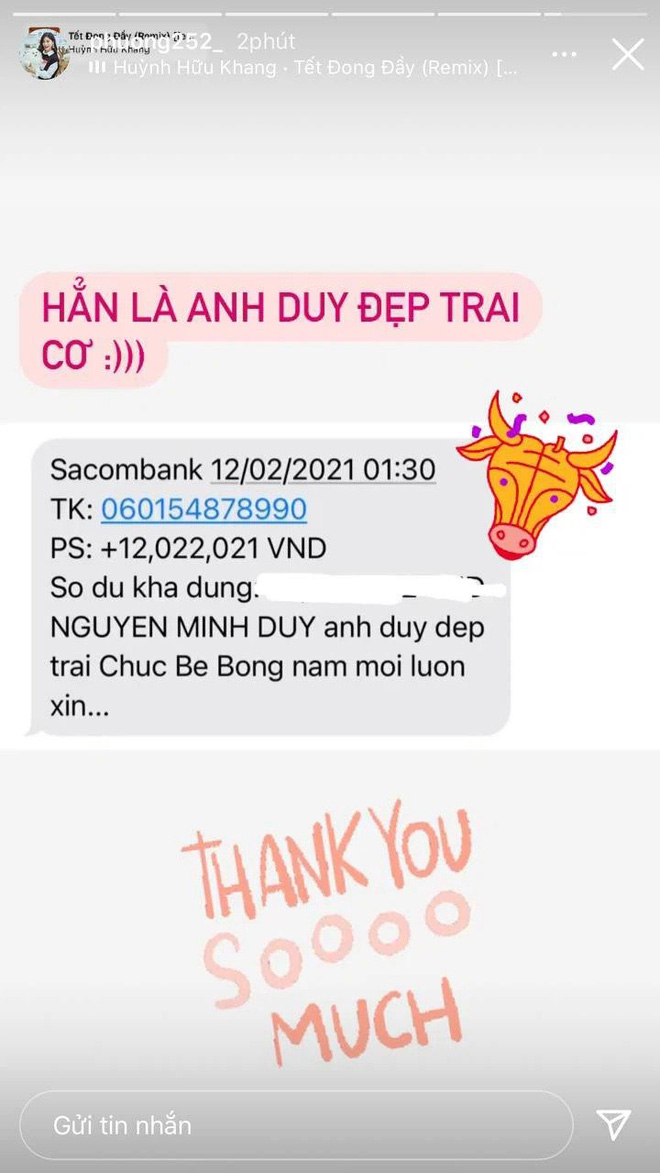 Valentine năm nay trùng với mùng 3 Tết nên nhiều cặp đôi đã tranh thủ gộp luôn khoản lì xì với quà lễ Tình nhân. Kết quả là ra con số trên trời như số tiền mà Khánh Linh - bà xã trung vệ Bùi Tiến Dũng nhận được từ chồng. Dụi mắt nhìn cho kỹ nha, là 222.222.222 đồng đấy!