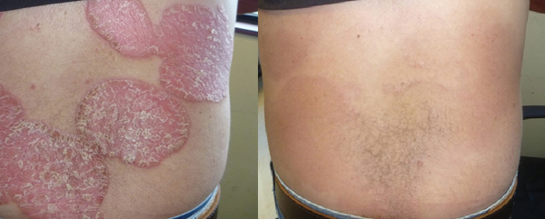 | Hình ảnh trước và sau 8 tuần sử dụng sản phẩm thảo dược Dr Michaels cho bệnh vẩy nến. |