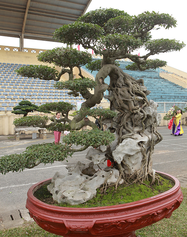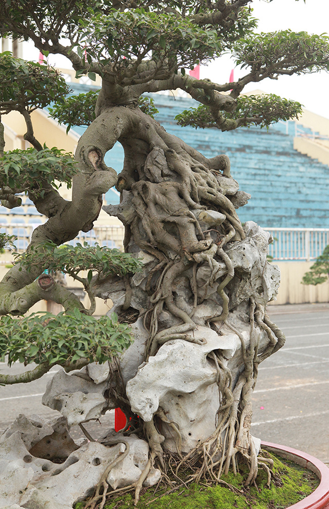 Tại triển lãm Sinh vật cảnh thị xã Sơn Tây (Hà Nội) mở rộng năm 2019, cây sanh cổ “ôm” đá có dáng uốn lượn từ trên xuống dưới như một dòng thác khiến nhiều người tò mò.