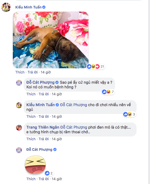 Trước đó, Cát Phượng đã chia sẻ hình ảnh "tự sướng" của mình lên trang cá nhân nhân dịp 2/9 nghỉ lễ. Ngay sau đó, Kiều Minh Tuấn vẫn vui vẻ gửi hình cún cưng vào comment. Cả hai trò chuyện vô cùng vui vẻ, Kiều Minh Tuấn còn tiết lộ về chuyện đi chơi nhiều.