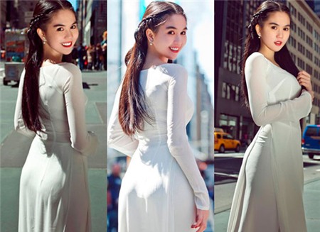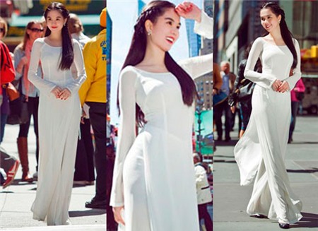 Khoác lên mình bộ áo dài trắng, Ngọc Trinh khoe tối đa những đường cong cơ thể và nước da trắng nõn nà. Trông cô nàng đẹp như nữ thần trên đường phố New York.