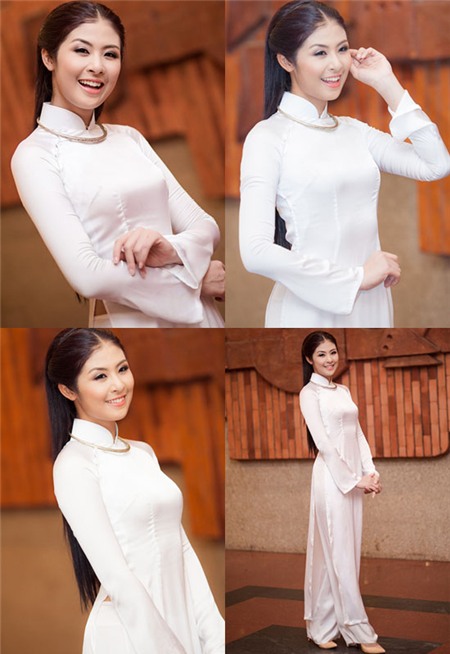 Không cần các phụ kiện rườm rà, đắt tiền, Hoa hậu Ngọc Hân vẫn thật xinh đẹp và quyến rũ trong chiếc áo dài trắng.