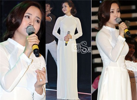 Vy Oanh trở nên thật nổi bật trên sâu khấu khi mặc bộ áo dài trắng tinh khôi.