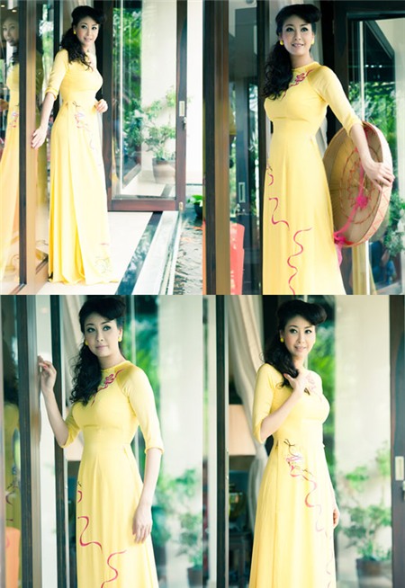 Bộ áo dài vàng làm nổi bật vẻ đẹp ngày càng mặn mà của Hoa hậu Việt Nam 1992 Hà Kiều Anh.