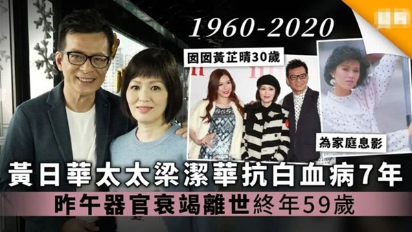 Vừa qua, truyền thông Hoa ngữ đưa tin cựu diễn viên Lương Khiết Hoa - vợ tài tử Huỳnh Nhật Hoa đã qua đời ở tuổi 60 sau 7 năm điều trị bệnh ung thư máu, suy đa tạng.