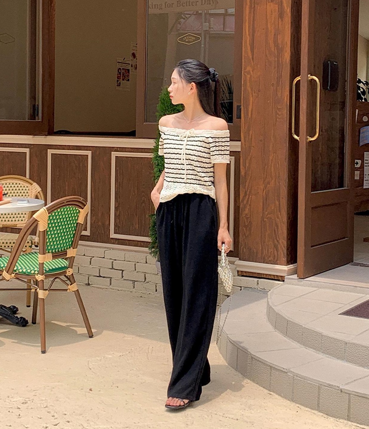 Áo trễ vai giúp vẻ ngoài trở nên nổi bật và quyến rũ hơn. Mẫu áo này có thể kết hợp được với quần cạp chun, tạo nên set trang phục đầy phóng khoáng, trẻ trung. Túi xách màu trung tính và sandal quai mảnh là những điểm nhấn tinh tế của bộ đồ.