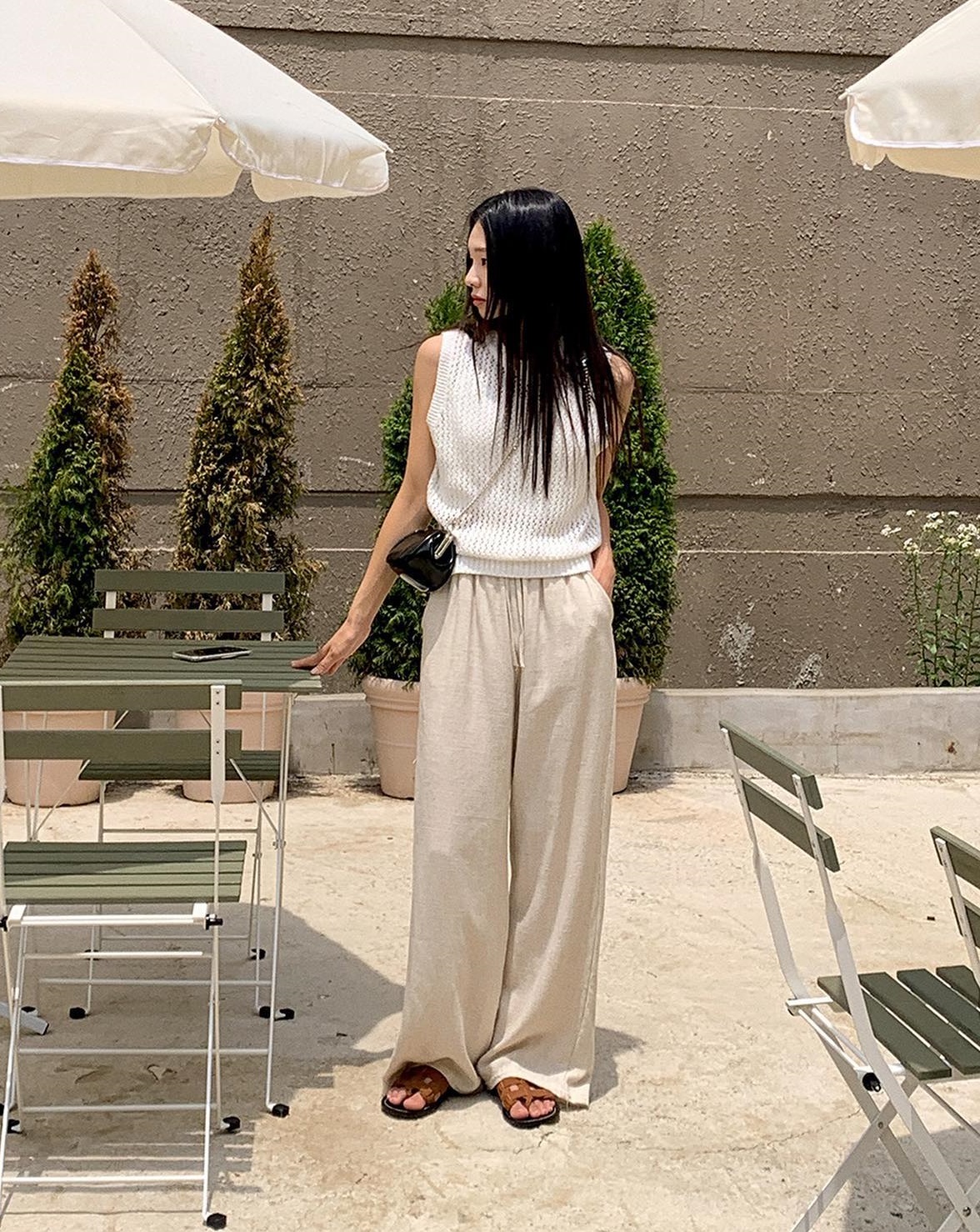 Set đồ trên trẻ hóa phong cách hiệu nghiệm nhờ các item như áo gile hồng pastel, quần linen trắng. Chưa kể, công thức này còn rất "ăn ảnh", chị em nên ghim để diện đi du lịch hè.