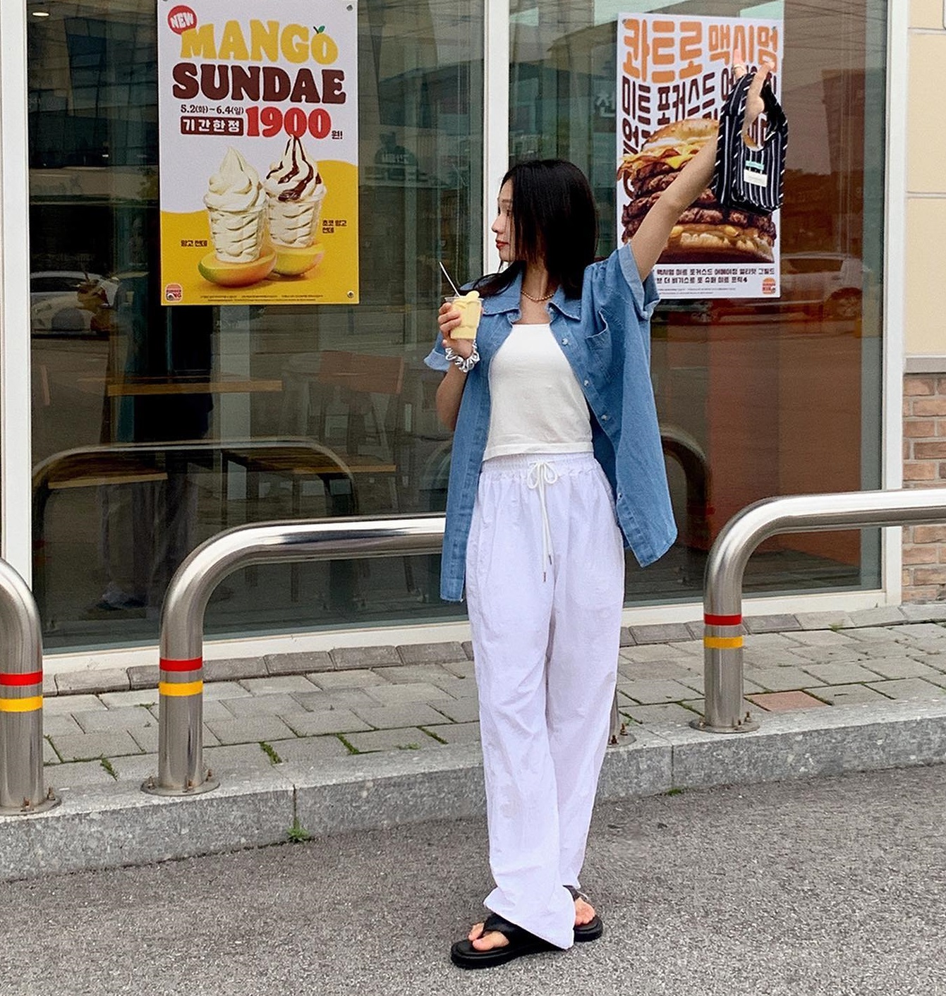Quần cạp chun rất phù hợp để phối đồ layer. Item này sẽ tăng thêm nét cá tính, thoải mái cho set đồ mùa hè. Outfit gồm áo quây trắng + sơ mi denim và quần cạp chun trắng cho hiệu quả "hack" tuổi tốt. Các nàng có thể áp dụng công thức này cho những chuyến du lịch hoặc khi đi dạo phố cuối tuần.