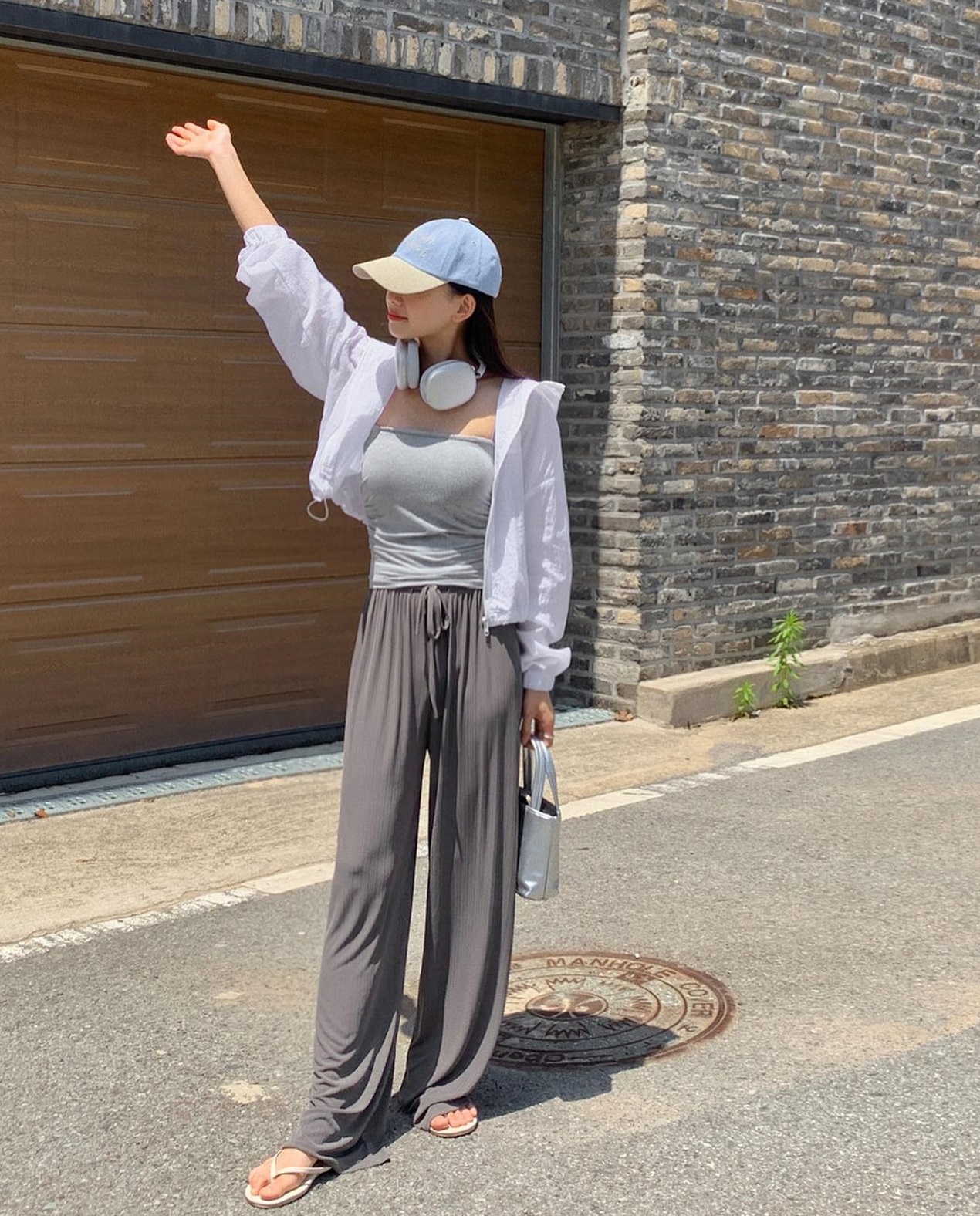Combo áo quây và quần cạp chun tôn lên vẻ quyến rũ của người diện. Để tránh nắng hiệu quả, các nàng nên khoác ngoài một chiếc áo mỏng, dài tay. Với các tông màu trung tính làm chủ đạo, set đồ trên còn có sự trang nhã.