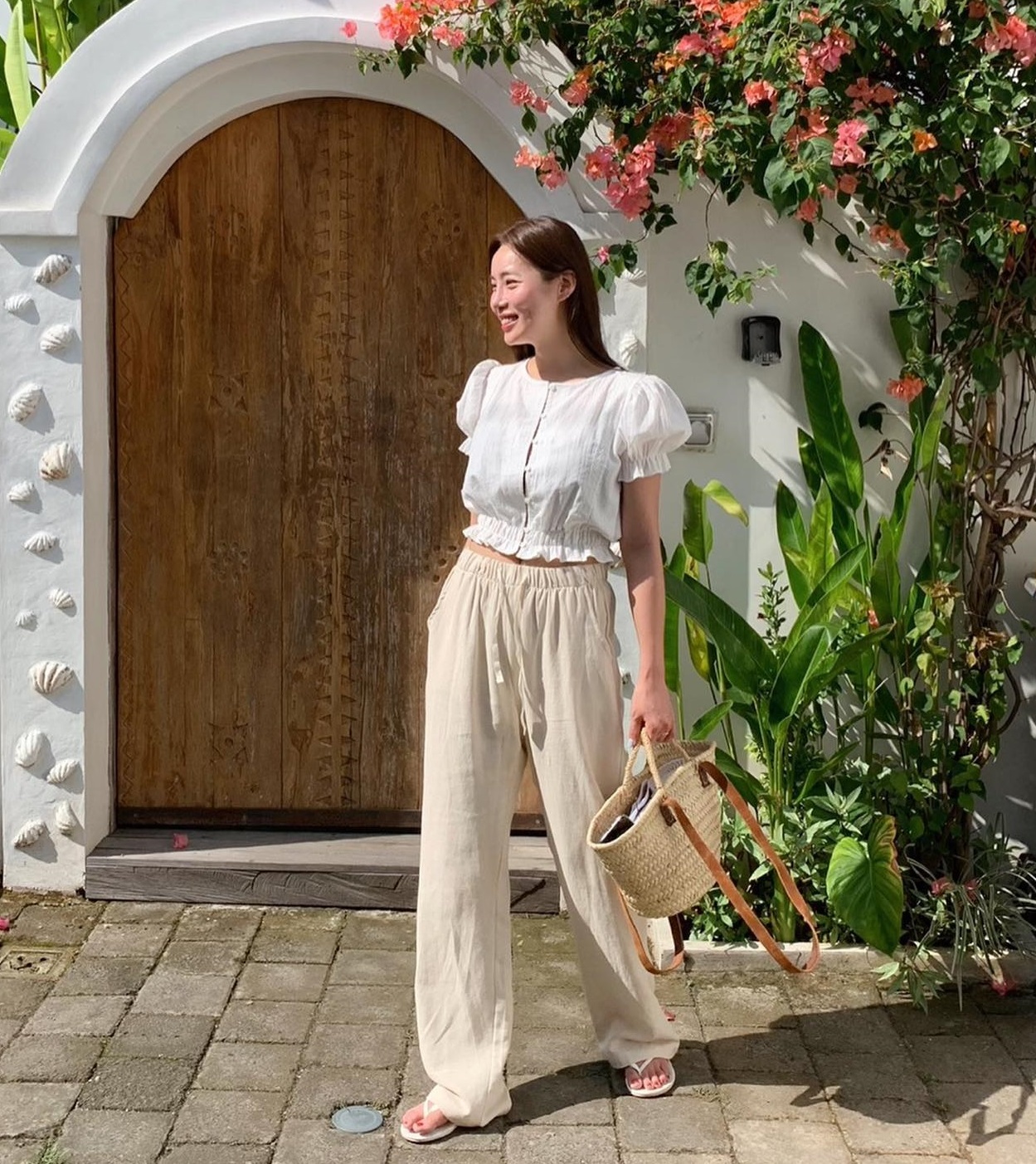 Quần cạp chun sẽ tạo nên các set trang phục đầy nữ tính, yêu kiều nếu bạn kết hợp với áo blouse. Set đồ trên còn ghi điểm ở độ nhẹ mát, thoải mái nhờ chất vải thô đũi. Chiếc túi cói là món phụ kiện lý tưởng để hoàn thiện outfit.