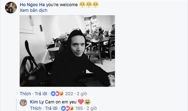 Không những vậy, Hà Hồ còn đăng tải một bức ảnh bình luận trong dòng status của Kim Lý thay cho lời chào của mình tới nam diễn viên khi anh có mặt tại Pháp. Đáp trả lại Hà Hồ, Kim Lý viết: "Cảm ơn em yêu". Mặc dù đã từng nhiều lần nói những lời ngọt ngào với bạn gái nhưng đây là lần đầu tiên Kim Lý dùng tiếng Việt để thể hiện tình cảm dành cho Hồ Ngọc Hà.