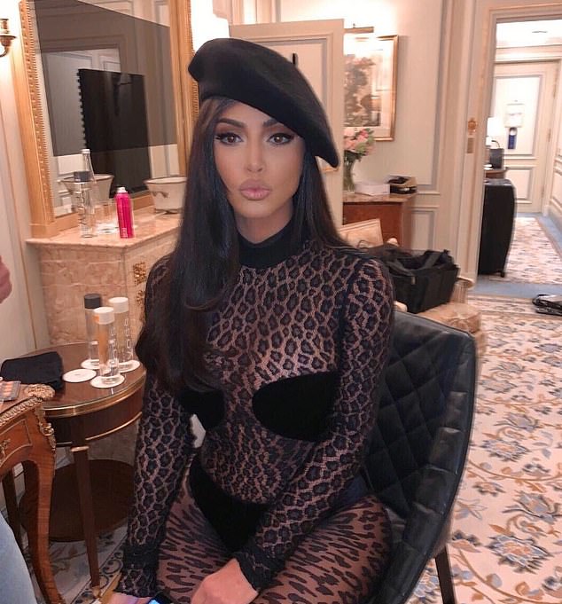 Kim Kardashian mặc trang phục xuyên thấu in họa tiết da báo tại Tuần lễ thời trang Paris.