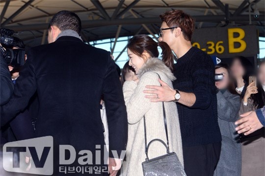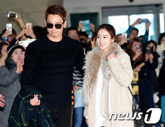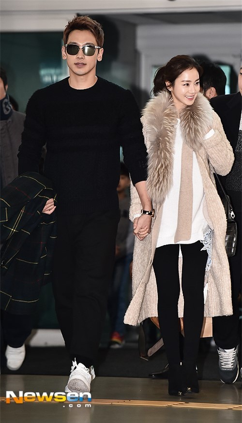 Rain mặc trang phục thể thao trong khi bà xã diện áo len dài, quần jeans bó và khoác áo choàng lông. Hai người nắm chặt tay tình cảm, liên tục cúi chào và cảm ơn truyền thông cùng khán giả hâm mộ. Nắm được lịch trình của đôi vợ chồng, tại sân bay Incheon có khoảng 200 phóng viên túc trực từ sáng nay.