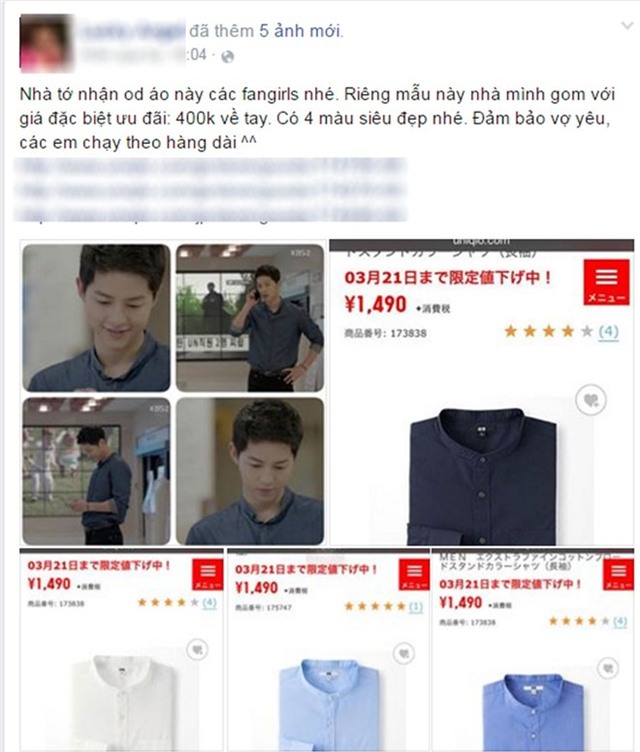 Do đó, thay vì mua hàng "xịn", nhiều chủ hàng tại Việt Nam thay thế bằng sản phẩm có thiết kế khá tương tự của Uniqlo. Chiếc áo này được rao bán với giá 400.000 đồng, cao hơn một chút so với giá niêm yết của sản phẩm là 1.490 yên Nhật (tương đương 300.000 đồng).