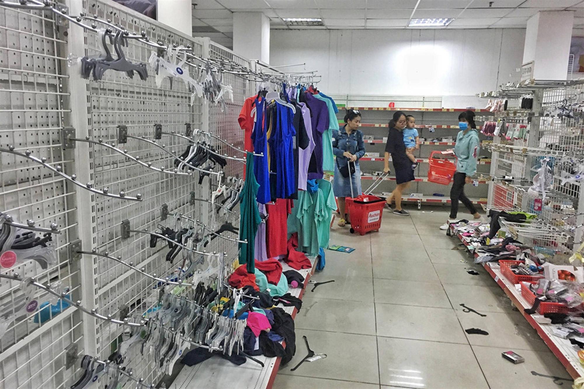 Khu bán quần áo gần như đã hết hàng, nhiều quần áo bị vứt xuống sàn sau khi khách lựa xong. "Trường hợp khách uống nước, uống sữa thì bên siêu thị sẽ chấp nhận tổn thất đó. Hiện tượng này đều xuất hiện trong các siêu thị ở TP.HCM, Hà Nội", quản lý siêu thị ở đường Trần Bình Trọng (quận 5) chia sẻ.
