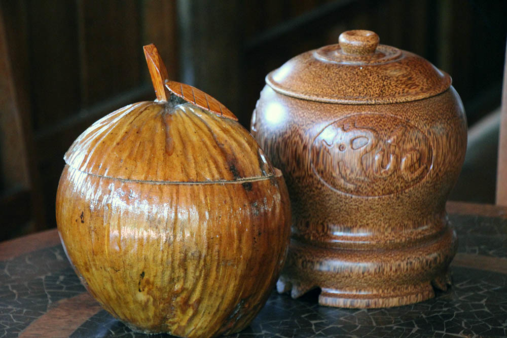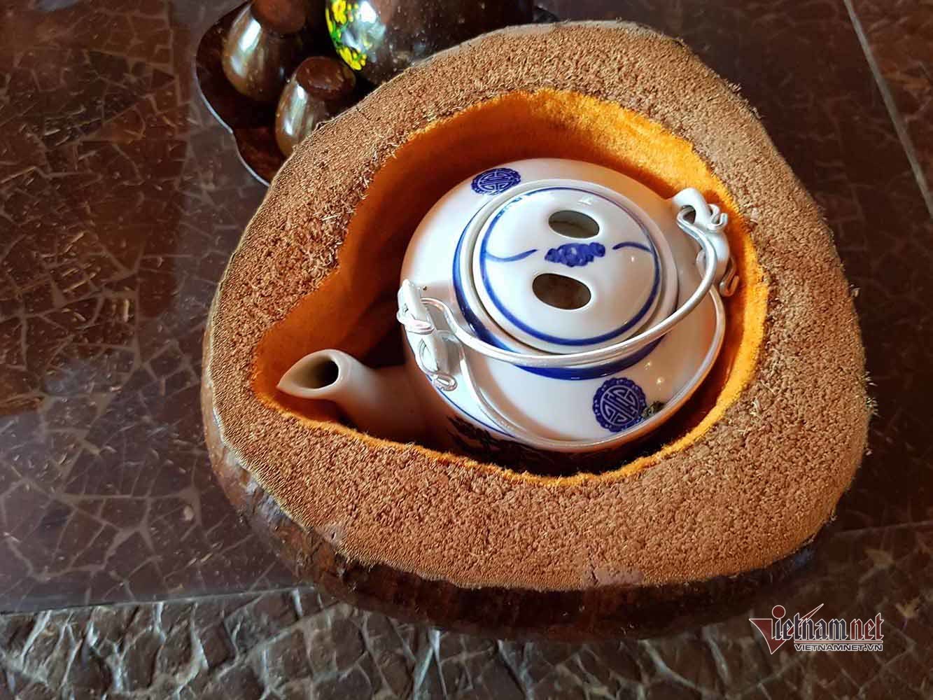 Trái dừa khô được sáng tạo thành dụng cụ giữ ấm trà