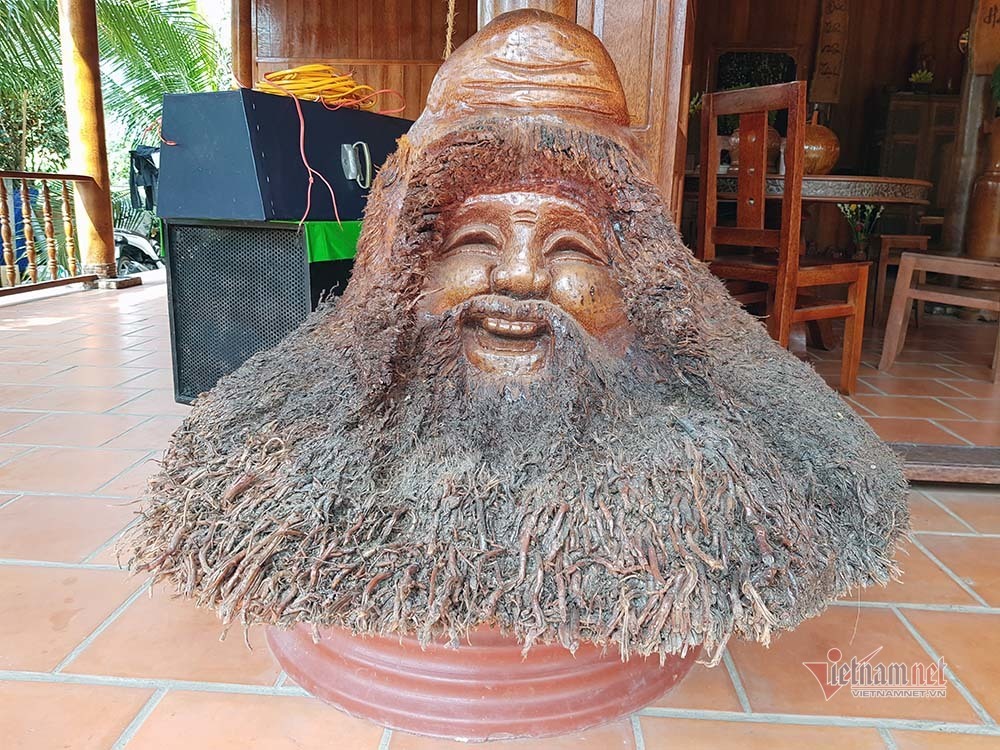 Ngoài ra, ngoài cửa còn có 4 tượng phật Phúc - Lộc - Thọ và phật Di Lặc làm từ rễ dừa.