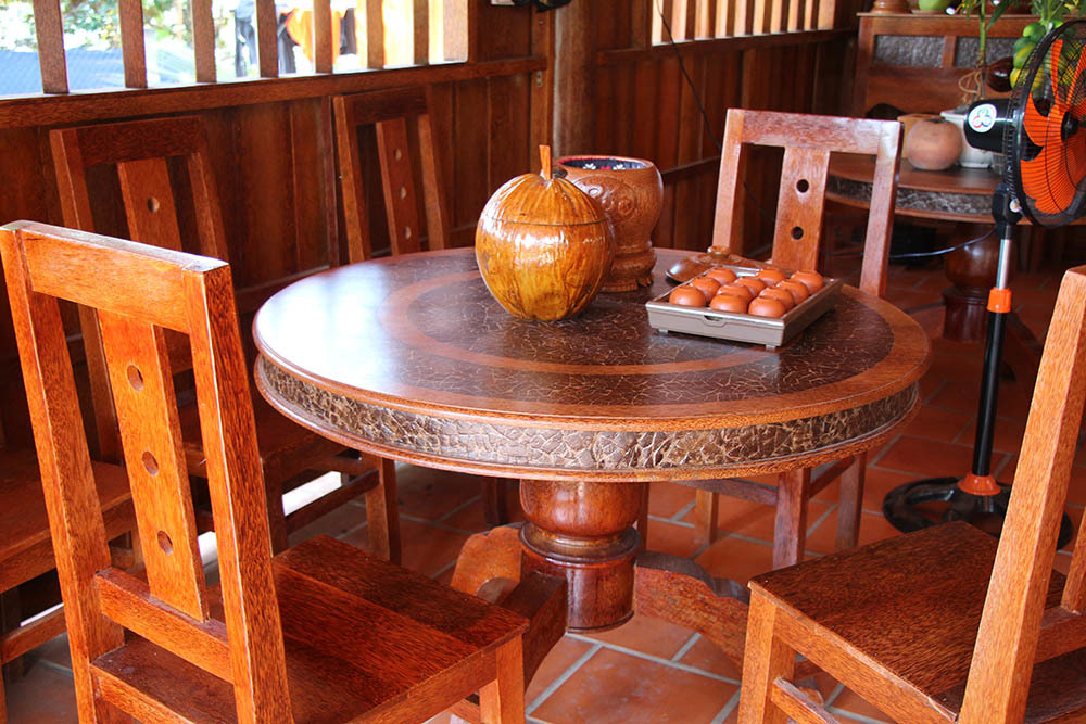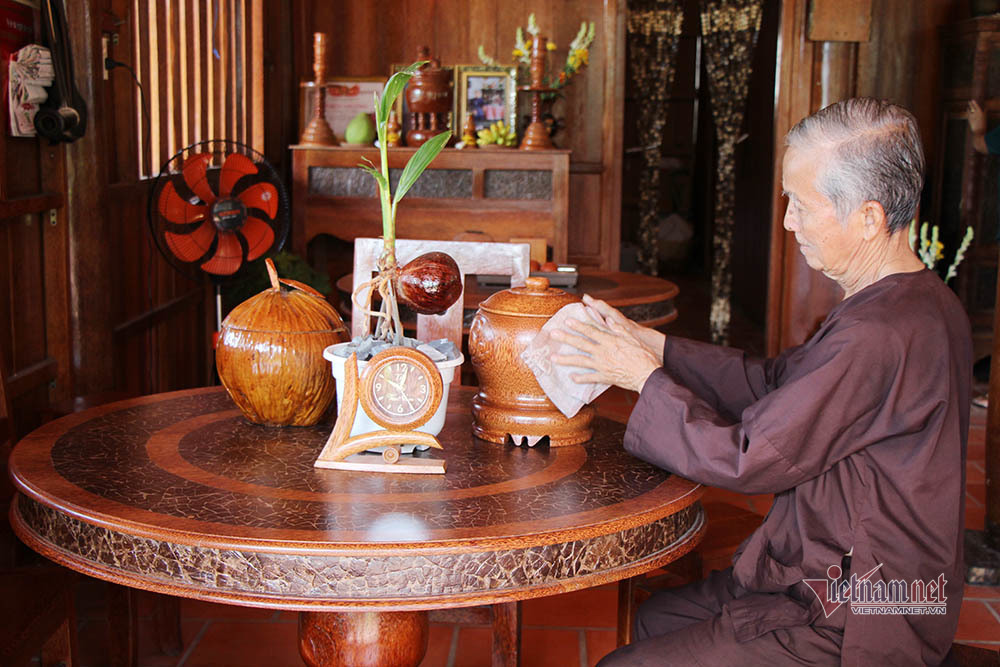 “Người ta khảm bằng xà cừ, còn mình làm khảm bằng gáo dừa cho lạ”, bà Giác cười nói và cho biết, lư hương, tượng phật, liễng thờ cũng được làm bằng dừa. Vách nhà, cột kèo, chùm đèn, bình, cửa… đều làm từ loại cây dừa.