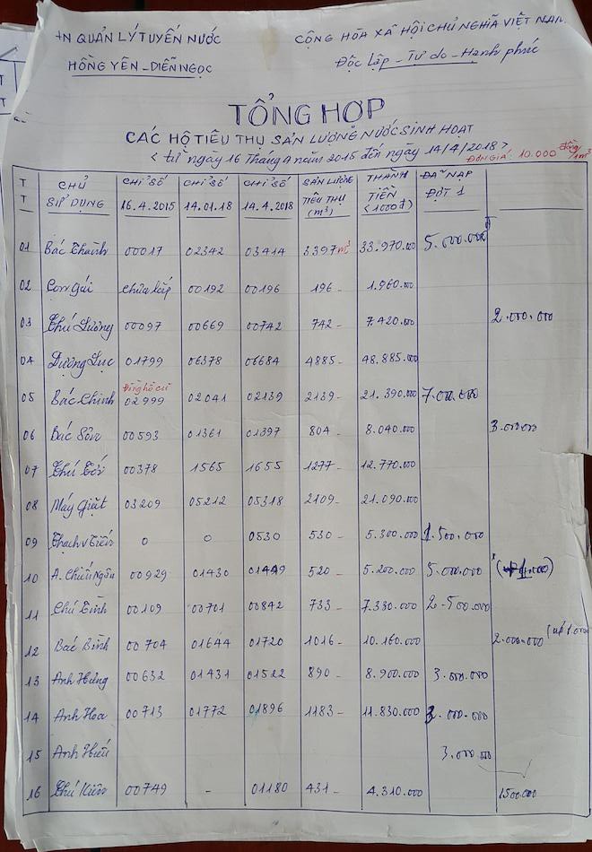 Ông Hồng chia sẻ khó khăn với các hộ dân và cũng cho biết việc không thu tiền nước theo tháng là thiếu sót. Từ tháng tới, với chỉ số đã chốt ngày 14/4, ông Hồng sẽ thu theo tháng.