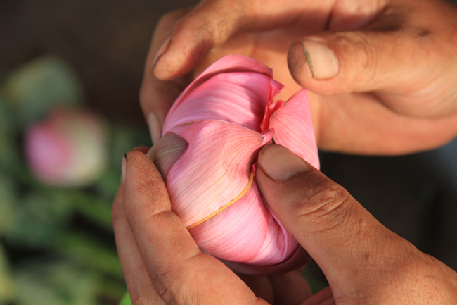 Theo anh Vũ, một trong những người ướp trà sen đã 5 năm qua cho biết, để ướp trà mộc, người ướp trà phải dậy từ sáng sớm hái những bông sen còn đượm sương đêm, sau đó mang về lách từng cánh lá sen ra để đổ chè vào.