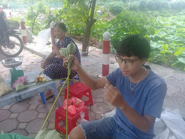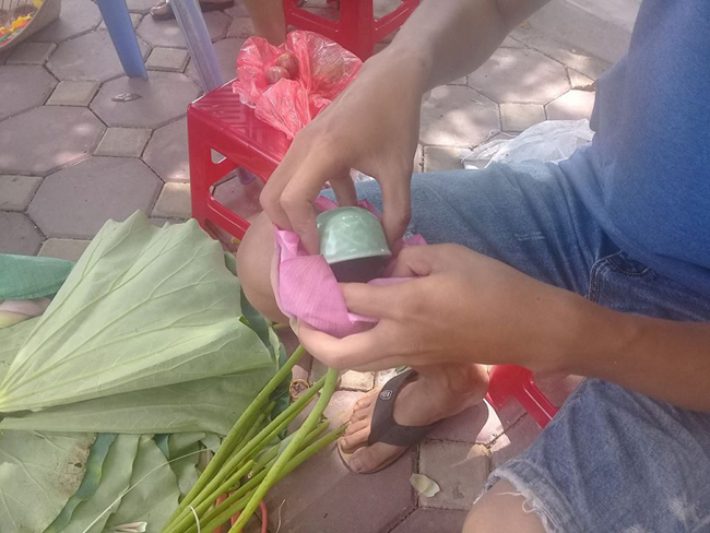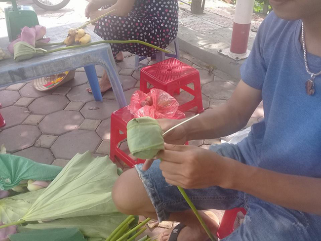 Sau khi cuốn những cánh sen đã ôm lấy trà, người ướp trà dùng chính mảnh lá sen được cắt dưới hồ lên để gói chúng lại, buộc thêm bằng một sợi dây rơm nếp.
