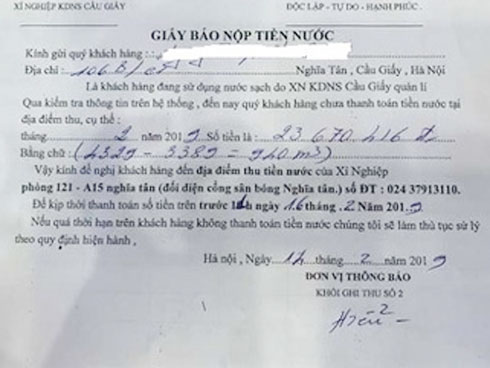Trước đó, chị Vũ Thị Thu (chủ hộ 106B – C1 Nghĩa Tân, quận Cầu Giấy, Hà Nội) phản ánh, chị đã rất “sốc” khi nhận được hóa đơn thanh toán tiền nước tháng 1/2019 là hơn 23,6 triệu đồng cho 940m3 nước. Trong khi những tháng trước đó, gia đình chị chỉ dùng nước dao động trong khoảng 22-72m3 với số tiền chưa quá 2 triệu đồng/tháng.