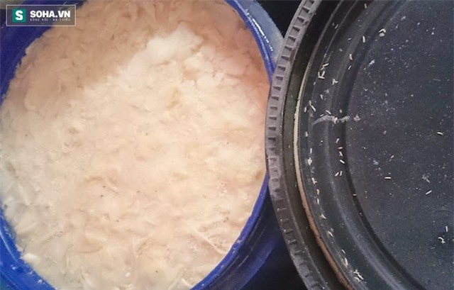 Nhiều thùng măng có lẫn giòi bò lúc nhúc với măng. (Ảnh: Tâm Thanh).