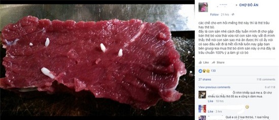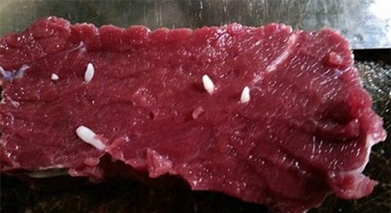 Miếng thịt có màu đỏ như thịt bò “gây sốt” trên mạng bởi các hạt cơm trắng trên miếng thịt. Các bà nội trợ vô cùng hoang mang. Đặc biệt, các dị vật này bám rất chặt vào miếng thịt.