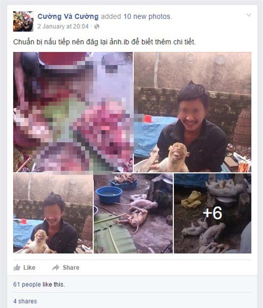 Theo ENV, những bức ảnh này bắt đầu được phát tán rộng rãi vào tối ngày 2-1 trên trang Facebook cá nhân mang tên Cường Và Cường . Mặc dù được chụp bằng điện thoại, nhưng những tấm ảnh vẫn đủ để thấy sự dã man, vô nhân tính của kẻ đăng tải khi mô tả chi tiết từng bước quá trình giết hại, lột da, chế biến và làm thịt khỉ để nấu cao. Hầu hết các độc giả khi xem ảnh đều bày tỏ sự bức xúc tột độ và mong muốn các cơ quan chức năng sớm xử lý hành động giết hại động vật hoang dã (ĐVHD) man rợ này.