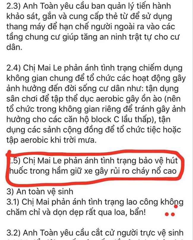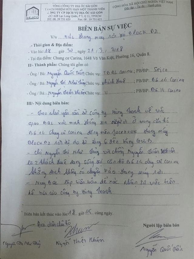 Trong đó nhiều người dân khi khai báo với cơ quan chức năng cho biết, trong tối 22/3 phía cư dân và ban quản trị chung cư có đối thoại với nhau về hàng loạt vấn đề xảy ra tại chung cư mà khiến họ búc xúc như: tình trạng rò rỉ điện trong các bảng quảng cáo gắn trong thang máy khiến 1 số người bị điện giật nhẹ, thang máy nhiều thời điểm không hoạt động, tình trạng bảo vệ hút thuốc tại khu vực tầng hầm….