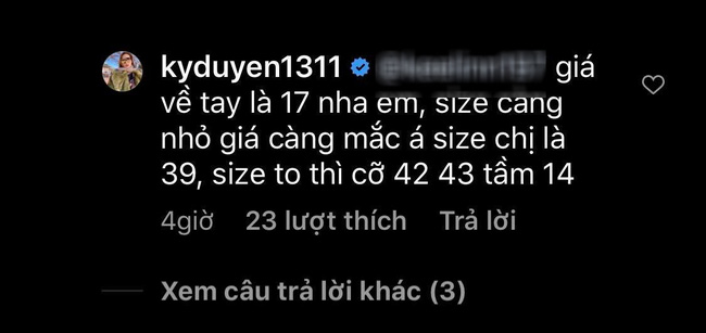 Kỳ Duyên còn vui vẻ tiết lộ mức giá về tay của giày hoa cúc đình đám này trên trang cá nhân: "Giá về tay là 17 triệu nha em, size càng nhỏ giá càng mắc. Size chị là 39, size to cỡ 42 43 tầm 14 triệu".
