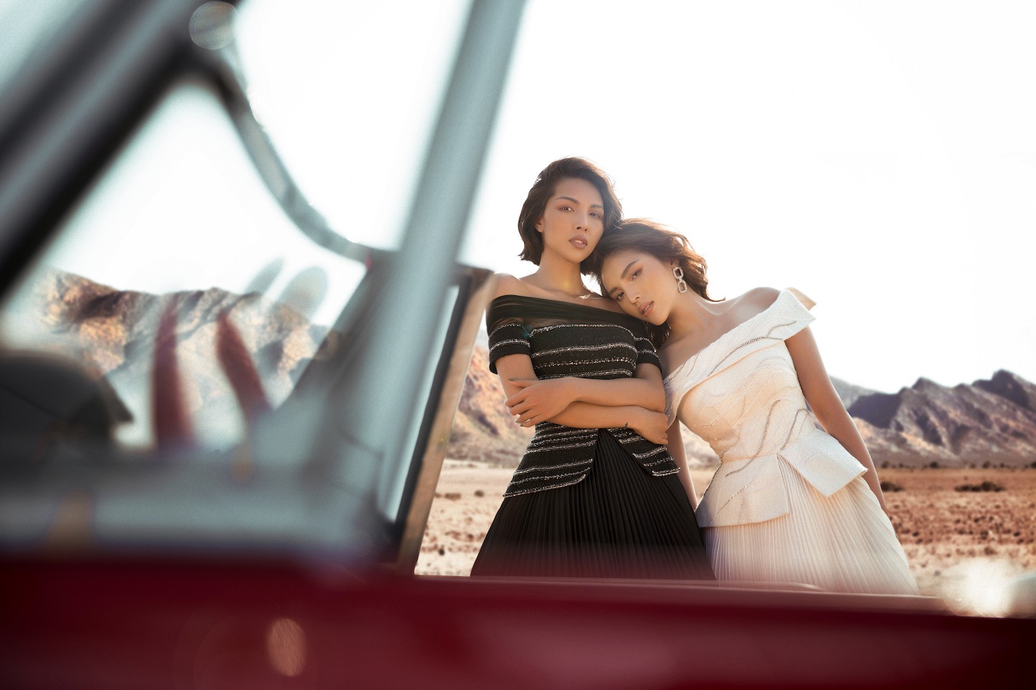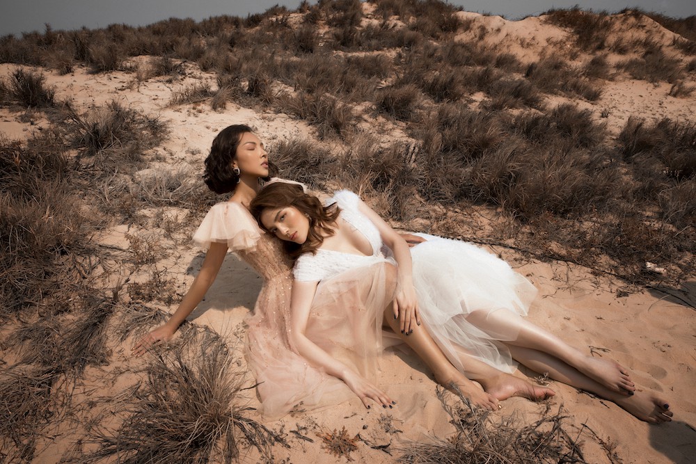 Trong những thiết kế của Lê Thanh Hoà, hai người đẹp tạo dáng giữa sa mạc theo ý tưởng của ekip.