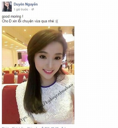 Đi kèm dòng chia sẻ xin lỗi là một bức ảnh vô cùng duyên dáng cùng nụ cười thân thiện của nàng Hoa hậu Việt Nam 2014.