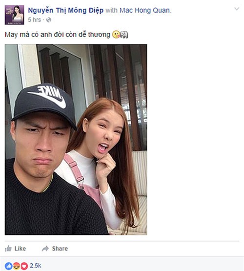 Sau đó Kỳ Hân đã đăng lên tấm ảnh hai người cùng chụp ảnh làm mặt xấu với nhau cùng dòng chú thích rất ngọt ngào: "May mà có anh đời còn dễ thương" như để xoa dịu chàng cầu thủ Than Quảng Ninh.