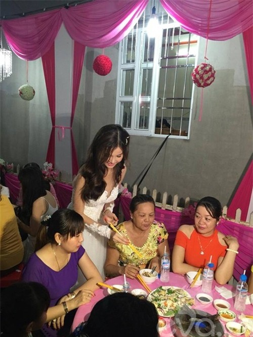 Cô tự tay gắp thức ăn mời các người thân, hàng xóm đã đến chung vui.