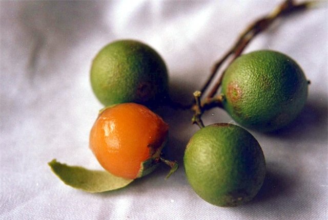 Mỗi quả chanh ruột nghệ này có kích thước 2-4cm. Quả chín từ tháng 6 đến tháng 9.